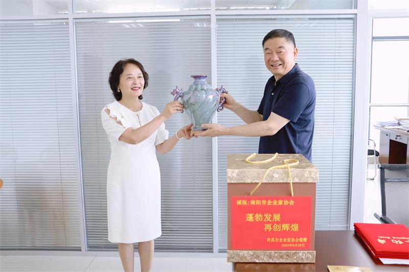 座談會上,南陽市企聯(lián)秘書長寧春士向許昌市企業(yè)家協(xié)會贈送《南陽企業(yè)家》雜志,黃玉霞代表許昌市企業(yè)家協(xié)會回贈鈞瓷作品《腰纏萬貫》,并預祝南陽市企聯(lián)、企協(xié)蓬勃發(fā)展,再創(chuàng)輝煌。